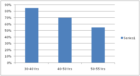 Success of treatment is almost 85% in age ranged between 30 years to 40 years. Success of treatment is almost 70% in age ranged between 40 years to 50 years. Success of treatment is almost 55% in age ranged between 50 years to 55 years (Figure 1).