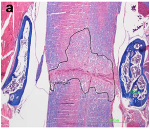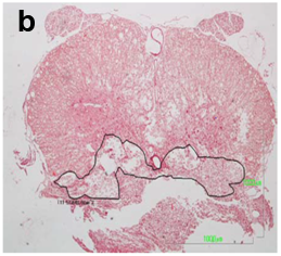 Figure 1a&1b The extent of the spinal cord injury was estimated in midsagittal sections in Luxol Fast Blue stain and serial cross sections.