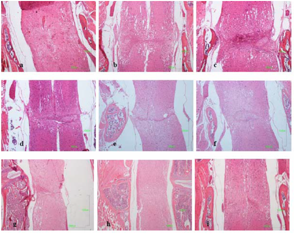 The spinal cord lesion in the mice was asymmetric and did not form a simple cone shape cranially and caudally from the epicenter, as occurs in rats and other mammals. More asymmetric and irregular was the form of restoration of gray and white matter. For these reasons, the extent of the injury was estimated in longitudinal median sagittal sections including the lateral funiculus of white matter, lateral horn of gray matter and central canal. Also, cross sections were also taken as serial sections (Figure 1a&b). The extent of the white and gray matter lesions was measured from the cranial to the caudal boundaries of cyst formation, neural cell damage and white matter demyelination, in Luxol Fast Blue and H/E stains. The lesion was measured in mm2 contralaterally to the epicenter in the white and gray matter. The extension of scar formation was calculated in two dimensions in Van Gieson stain (Figure 1c). The vertical length of the scar was measured in the widest area of the lesion. The percentage of the length of horizontal scar formation was estimated according to following