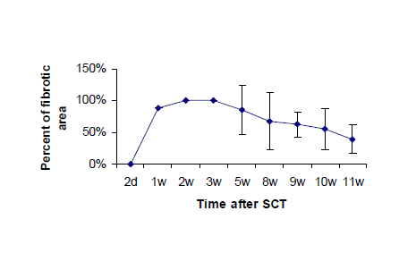 Figure 4 The fibrotic tissue appeared in the 1st week and was completely formed in the 2nd and 3rd weeks. It covered the entire width of the epicenter, dividing the spinal cord in two entirely separated parts. After the 3rd week it began to withdraw and was almost obliterated in 11th week.