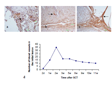 d. During the second week the initial lesion was highly vascularized and then the number of blood vessels declined significantly.