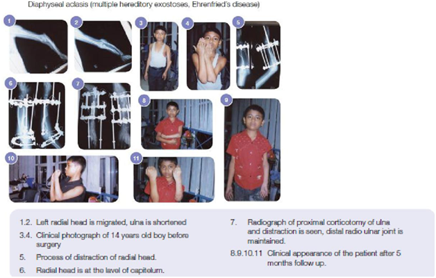 This disorder is an autosomal dominant inheritance. Long bones are more severely affected than the ribs, spine, scapula and pelvis. Most frequent in metaphysis of proximal and distal femur, proximal and distal tibia, distal radius and ulna. Ulna is shorter than the radius; radius is bowed laterally with its concave to the short ulna. Progressive posterolateral dislocation of the radial head is a common deformity. At wrist radial deviation is restricted and ulnar deviation is increased. Multiple hereditary exostoses (MHE) produce characteristic deformities of the forearm leading to problems at the wrist and elbow. Understanding the patho-anatomy allows one to correct all these deformities in a single or staged fashion. The purpose of this study is to report our clinical experience in the treatment of evaluation of the results of ulnar lengthening for correction of forearm deformities in multiple exostosis. We have corrected skeletally immature patients as well as adult patients to illustrate the scope of deformity and treatment.1–6