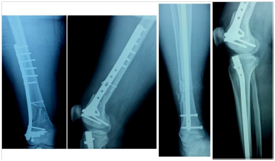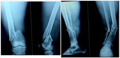 In our study, young male adults were the most affected with RTA the major cause. This is consistent with data from recent literature8‒14 and could be due to the fact that young adult males are more active hence at a greater risk of RTA than other groups of society. Most series in literature reported wound complications in more than half of the cases8‒14 which is similar to our study. In our study, these soft tissue injuries occur predominantly in the tibia compared to the femur, which can be explained by the anatomical situation of the 2 bones. Associated lesions are quite common with incidence of vascular injury ranging from 6.25% according to Fraser9 up to 9.37% in our series. These lesions can compromise short term results with wound complications leading to amputation. No nerve injury was found in our series, unlike some cases reported in literature9,13‒16 In our case, these lesions were ruled out on physical examination. Several associated injuries are reported by some authors given the impact of injury, setting of polytrauma and/or multiple fractures requiring multidisciplinary management8,10,12,14,17 In most of the series in literature, the proportion of extra-articular fractures in both bones is greater than articular knee fractures. There is also a greater incidence of shaft fractures compared to metaphyseal fractures in both bones (leg and thigh). Bifocal fractures of the tibia are very frequent according to some authors8,9,10,13,14,16,17 as was the case in our study where 68.75% of the cases involved were Fraser type 1 shaft fractures. All authors are unanimous on the need for urgent stable reduction. The mean time to reduction varies between 2days for Rethman U18 to 5.2days for BEHRMAN SW and coll.19 In our case series it was 2days. With regards to reduction, IM nailing was the most common method of fixation with 75% of femur fractures and 68.75% for tibia fixation, as reported by many other authors.10,12,13,17 However, in some studies, locking plates were preferred.11,16