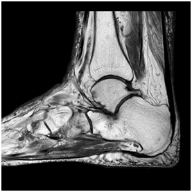 Foot and ankle problems are a common complaint in patients with rheumatoid arthritis, with a prevalence estimated at 80-90%.2–5 This case series describes three patients whom have rheumatoid arthritis. They each had multiple foot and ankle insufficiency fractures which were not detected on X-ray imaging, but were later diagnosed on MRI. Insufficiency fractures may be difficult to diagnose in patients with rheumatoid arthritis. Presentation of an acutely painful ankle joint may be wrongly presumed to be synovitis. This may lead to a delay in diagnosis of the fracture. In one study, the delay was an average of 31 days.6 Patients may receive intra-articular steroid injection for a joint thought to be inflamed, but was actually fractured. Insufficiency fractures in patients with rheumatoid arthritis may occur due to the chronic inflammatory nature of the disease itself. Prolonged inflammation increases the risk of structural changes which may include peri-articular osteopaenia, bone erosions, tendinopathies, and skeletal deformities. These may place abnormal biomechanical stresses on the feet and increase predisposition to insufficiency fractures. Prolonged, repeated course of corticosteroids are often used to treat flares of inflammation in patients with rheumatoid arthritis, although significantly fewer glucorticoids are used now than historically. Glucocorticoid-induced osteoporosis is mediated via increased osteoclast-mediated bone resorption, and reduced bone formation by inhibition of osteoblast proliferation and differentiation, leading to loss of bone mass.7,8 This increases risk of fractures, with up to 50% of patients with chronic glucocorticoids use sustaining insufficiency fractures.9,10