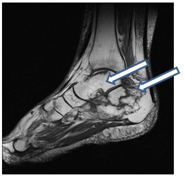 Case series: Three patients with rheumatoid arthritis who sustained foot and ankle insufficiency fractures which were only detected on MRI. All three patients were on biologic treatment and methotrexate for RA, and two had evidence of hind-foot deformity. All had evidence of osteoporosis on bone density scan, and two were already on intravenous zolendronic acid.