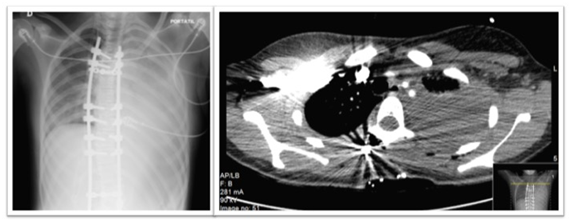 Twenty-four hours after the surgery the patient started to complain of thoracic pain with pleuritic characteristics. A blood gas analysis without oxygen supply was carried showing a hypoxemia with an arterial partial pressure of oxygen of 69 mmHg and a two-unit drop on haemoglobin. A new thoracic roentgenogram was carried and showed a massive hemothorax, which was confirmed by CT imaging. Angio-CT imaging allowed excluding pulmonary thromboembolism. Misplacement of pedicle screws was also excluded by the original CT scan (Figure 1&2).