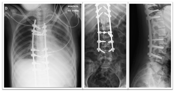 A rod was placed on the concave side of the main curve and, along with a reduction maneuver allowed for partial curve correction. The same procedure was carried with the contralateral rod with subsequent derotation cluster maneuver.1,3 The patient remained hemodynamically stable during the whole procedure and the postoperative thoracic roentgenogram lacked pleural or parenchymal alterations. Nevertheless, due to intraoperative blood loss, two units of red blood cells were transfused, achieving postoperative haemoglobin of 12.5 g/dL.