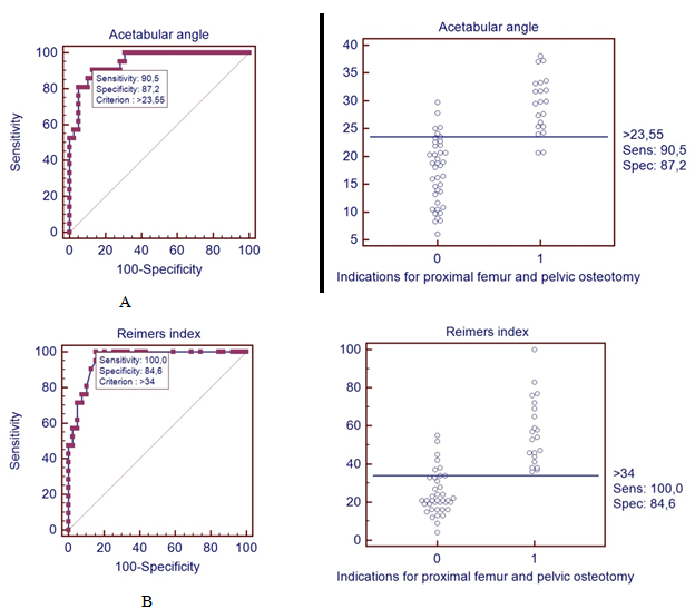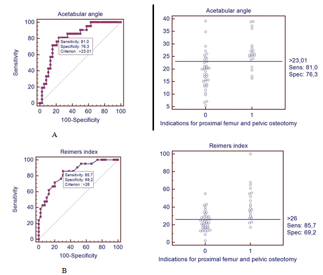 Figure 3 A,B ROC analysis to determine the prognostic value of indicators concerning the probability of indications for pelvic and proximal femur osteotomy in patients with CP. Critical level of parameters for the two groups ("Indications for proximal femur osteotomy" - 0; " Indications for pelvic and proximal femur osteotomy " - 1) is based upon: acetabular angle (A), Reimers' index (B). (PATOOM).