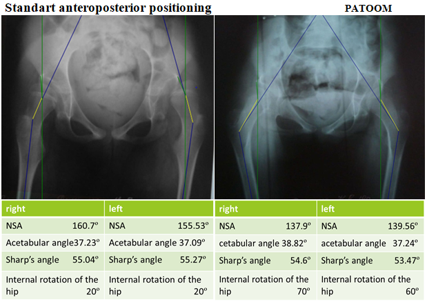 Figure 2 A 10-year-old patient with cerebral palsy. The change of neck-shaft angle(NSA) depending on positioning. On a standard anteroposterior radiogram the NSA is projective, on the original positioning true. The indicators of the acetabulum have not undergone significant changes and are within the statistical error. This is important, because when we perform a standard anteroposterior radiogram, the patient lies on his back, and with the original positioning lies face down. The angle of internal rotation of the femur when we perform the radiogram by original positioning corresponds to the angle of femoral torsion determined clinically by Ruwe. Both radiographs of the child's hip joints were performed in one day.