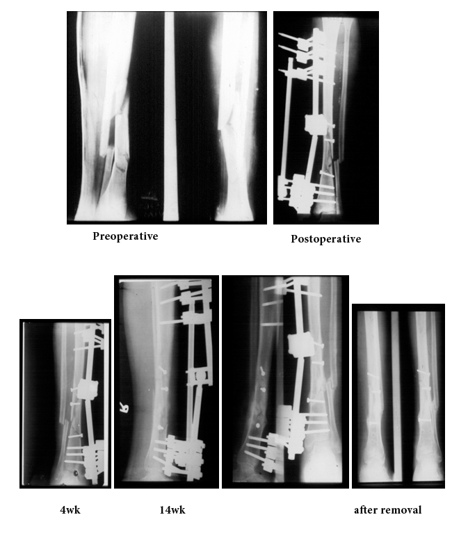 The duration of hospitalization averaged 10-15 days. 19 (95%) fractures healed without additional procedures. The average of duration of external fixation was 16 weeks (range 12-26 weeks). The time of union judged both clinically and radiologically averaged 16 weeks (range 12-30 weeks). There were 17 (85%) fractures pass to sound union within 12-20 weeks. Two (10%) fractures progress to delayed union and take 26-28 weeks to unite without any surgical interference. And only one case (5%) passes to non-union in the distal fracture site after 32 weeks of our treatment, which may be due to: