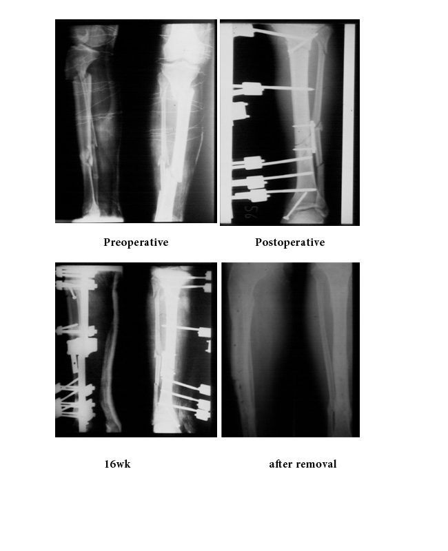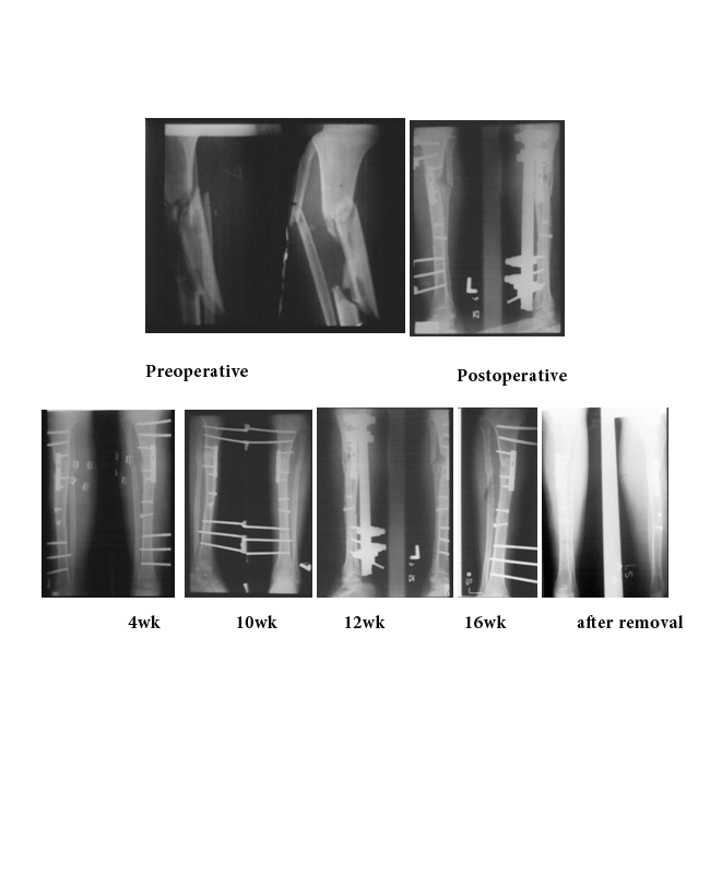 Fractures of the shaft of the tibia cannot be treated by a simple set of rules. By its very location the tibia is exposed to frequent injury.1 Segmental fractures define as; at least two fracture levels (bifocal, trifocal), separating one or several intermediate fracture fragments of tubular bone with intact circumferential cortex of intermediate segments, (AO type 42-C2) 2 often occur after a high energy direct trauma with consecutive severe soft tissue injury and a high energy fractures. Every fracture is an individual problem because ofthe blood supply of the intermediate bone fragment can be severely disturbed, and therefore the decision to treat it by internal fixation or, indeed, conservatively should be based on a realistic assessment of the advantages and the hazards of each method in the circumstances of that particular case. This calls for a high degree of clinical judgment, which is harder to acquire, or to impart, than technical virtuosity in the operating theater. The indications for operative and non-operative treatment of tibial shaft fractures have not been well defined.3