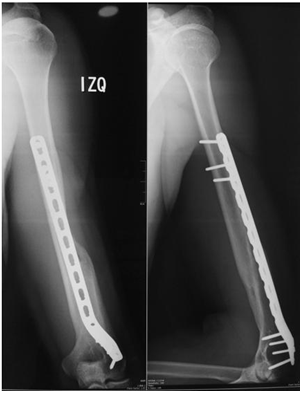 Regarding the complications, three cases showed delayed union, two of them consolidated successfully at 16 weeks and the other case at 20 weeks without requiring reinterventions. One case presented praxia of the radial nerve in the postoperative period, which was recovered six months after the postoperative period. One case presented postoperative pain at the surgical site without requiring removal of the hardware one case presented a localized cellulitis associated with burns in the anterior region of the arm handled with antibiotic treatment. There were no cases of infection of the operative site off loss of fixation. Heterotopic ossification occurred in one case without impaired functionality.