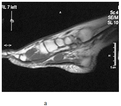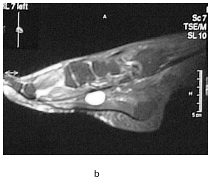 The patient had a positive Tinel’s sign and the symptoms aggravated with the orthopedic shoes that were made by a model of her feet.3,6 These two facts in most cases lead to Morton’s neuroma as differential diagnosis, but in our case the severity of the symptoms that were near to disabling and the non-responsiveness to physical therapy led to a condition more serious than irritation of the medial plantar nerve.7,8 Thus, an MRI of the patient's left foot was advised, which proved to be the key for correct treatment and diagnosis of this condition. There can be more than one cause of metatarsalgia, including: interdigital neuroma (also known as Morton’s neuroma), metatarsophalangeal synovitis, avascular necrosis, sesamoiditis, and inflammatory arthritis.8 Other conditions such as tarsal tunnel syndrome can also present with pain or numbness in the metatarsal region. Metatarsalgia is a condition that occurs relatively frequently. Schwannoma of the medial plantar nerve is relatively rare condition, resulting in pain and numbness of the innervating area of the nerve. Often pain irradiates in mid-front or/and in posterior part of the foot, mimicking some of the former mentioned conditions. Due to this, in diagnosis and treatment of Schwannoma of the foot, detailed physical examination and appropriate MRI scans are essential.