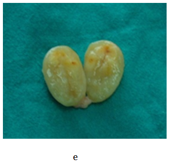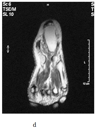 The operative and postoperative period passed without complications but she continued to have the same problems after the surgery. The patient received analgesic medications few months before she came to our Clinic. On her first visit at our outpatient clinic in July 2008, orthopedic shoes made on a plaster model of her feet with metatarsal pad were prescribed. On the control examination, the patient complained that the symptoms were worse and even disabling. An urgent MRI of the left foot was advised. The MRI showed a 2.5-centimeter in diameter, round, encapsulated mass that was differentially diagnosed as lipoma or neuroma (Figure 1a-1d). A surgical extirpation of the tumor was suggested. The operation was performed in September 2009 at the University Clinic for Orthopedic Surgery. At the level of the medial cuneiform bone of the foot, a round encapsulated mass, surrounding the medial communicant branch of medial plantar nerve was found (Figure 1e). Since the tumor could not be detached from the nerve, a neurectomy of the nerve proximal to the tumor was done. There were no complications in the operative and postoperative period. The excised tissue was sent for histological examination and the result confirmed it to be a Schwannoma (Figure 1f). After surgery, the patient was relieved of all symptoms. Follow-up visits were carried out at three, six and twelve months after the excision of the Schwannoma. The patient had no pain and function of the left foot was normal at each consecutive control.