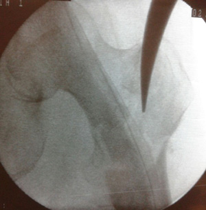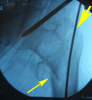 Figure 1b Manipulation with Steinmann pin to correct neck shaft angle as demonstrated by medial continuity and correction of overlap (arrow).