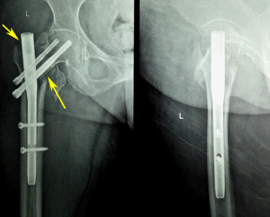 Figure 6c Three months post-operative radiograph showing varus collapse (small arrow) and differential migration of the hip screws (long arrow), with the caudal one migrating laterally (typical of the Z-effect).
