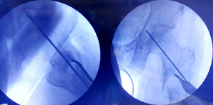 The current study is a critical appraisal of the technical hitches, errors and modes of failure of PFN in the course of its evolution in treatment of unstable trochanteric fractures. All patients with unstable trochanteric fractures from July 2013 to June 2015, treated with PFN were included in the study. All the patients gave the informed consent for inclusion into study and the study was approved by the ethical committee of our hospital. The study was performed in harmony with the Ethical standards of the 1964 Declaration of Helsinki as revised in 2000. All unstable fracture patterns according to AO/OTA classification were included in the study16 comprising fracture patterns including the reverse oblique, broken lateral wall, trochanteric fracture with subtrochanteric extensions. All patients were evaluated at the end of 2 years. Pre-operative evaluation of the patient included age, sex, mode of injury, fracture classification, pre-operative mobility status, Harris hip score17 and other co-morbidities. Patients were operated on fracture table with closed or minimal open reduction to create a mechanically stable fracture-bridging osteosynthesis using PFN. Fixation of fracture with a PFN was carried through longitudinal traction on a fracture table, under C-arm guidance, with five small incisions (one for entry point, two for proximal locking screws and two for distal locking bolts). In the case of failed closed reduction, manipulation with Steinmann pin was done (Figure 1a & b), and in some cases we have to enlarge the probable incision site for proximal neck screws, so as to apply reduction forceps. For distal locking we mostly used both dynamic and static locking bolts. Both shorter and longer versions of nail were used depending upon the extent of fracture. The intraoperative characteristics studied were duration of surgery, blood loss and technical difficulties encountered in fixation with PFN. Post-operative findings recorded were post-operative complications, mobility status and shortening at final follow-up of 2 years. For better understanding of PFN implantation techniques, the technical hitches were classified into: