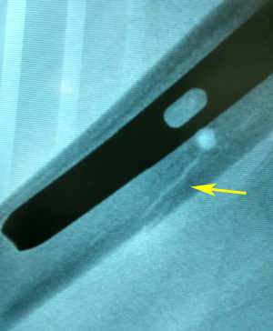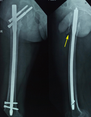 Figure 4a Image showing the iatrogenic fracture of the femur at locking bolt site, as a result of hammering the Steinmann pin to make entry portal for locking bolt (arrow).