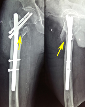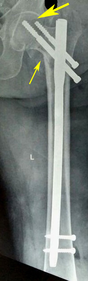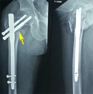 There can be hitches while reaming over guide wire for hip screw, as guide wire may bend slightly as it reaches the hard subchondral bone. Drilling over bent guide wire may result in its breakage. We had 3 such complications. We recommend partial drilling over guide wire just proximal to bend, followed by pulling of guide wire up to the level of its bend, then drilling of hard subchondral bone by drill bit itself under C - arm guidance to prevent guide wire breakage. The guide wire is then reinserted after the removal of reamer for screw insertion. One should also avoid using previously damaged guide wires. Sometimes there is mismatch between the jig and the nail leading to difficulty in negotiating the drill for the hip screws due to some manufacture or implant assembly related problems. We had 4 such problems, three for lag screw and one for derotation screw. Prior to nail insertion, one should check the jig nail assembly for its alignment. Drilling with smaller sized reamer and proceeding with regular reamer will also help. One should also check the jig whether it is loosened or not. Sometimes manipulation and hammering may result in loosening of jig and subsequent mismatch. Sometimes distal locking may also be troublesome. In one of our case distal locking bolt missed the nail while in another hammering the Steinmann pin to make entry portal for locking bolt, resulted in iatrogenic fracture (Figure 4a & b). Patient was put on long leg slab, which resulted in healing of the iatrogenic fracture. One should always do locking with drill bits and should avoid doing with Steinmann pin and hammer, which may shatter the cortex as was seen in our patient.