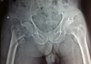 A 70 year old male with unstable fracture pattern was submitted to osteosynthesis with PFN. The fracture was classified as AO/OTA type 31A2.3 (Figure 6a). Immediate post-operative radiograph of the patient revealed relatively unstable fracture fixation because of loss of antero-medial buttress, superior placement of hip screws, almost same level of screw tips of both lag and derotation screw (Figure 6b). Because of relatively unstable fracture fixation, patient was advised delayed weight bearing. At home, patient started weight bearing with aid of walking frame. At 3 months post-operative, the patient evolved with varus collapse and differential migration of the hip screws, with the caudal one migrating laterally (typical of the Z-effect, Figure 6c). Patient was offered for removal of derotation screw. Patient refused for any surgical intervention as he was up and about with walker with minimal pain.