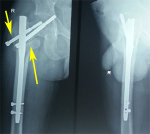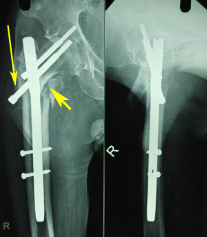 Figure 5c Six weeks post-operative radiograph showing varus collapse (thin arrow), cut-out (thick arrow) and fixation failure.