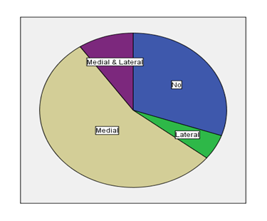 Whereas bone bruises at the tibial side showed 3.7% medially, 22% laterally, and 12.1% both sides. The results showed that 15 patients with MCL injury. Out of those 13 had complete ACL injury and 3 patients had partial. Also 40 patients had PCL injury. Out of those 27 had complete ACL injury and 13 patients had Partial?