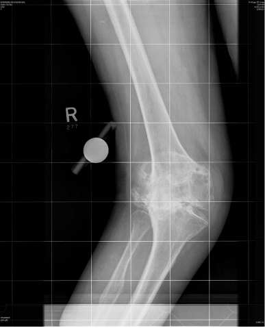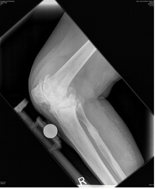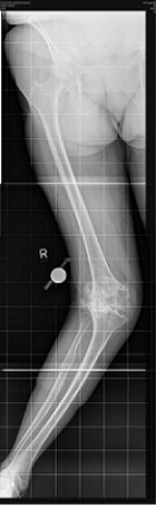 A 76 year old woman presented with a painful, valgus right knee which had progressively worsened over past 2 years. On clinical examination she had a marked valgus deformity of her right knee measuring 49° using a goniometer. Range of motion on examination was measured to be 5° to 100° with an extensor lag of 15°; the valgus deformity was not correctable on clinical examination. Radiographs confirmed a massive valgus deformity of the right knee with a bony defect in the lateral femoral condyle and lateral tibial plateau (Figure 1–3). The patient was consented to have a simultaneous peri-articular femoral osteotomy and total knee arthroplasty procedure in order to address the severe valgus deformity and osteoarthritis. The patient was informed that the data concerning her case would be submitted for publication and an informed consent obtained. Pre and post operative WOMAC and VAS scores were obtained.
