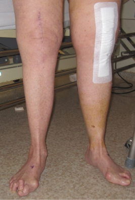 The patella tracked laterally at the end of the procedure, despite patella resurfacing. In order to address this quadricepsplasty and vastus medialis oblique (VMO) advancement was performed, allowing compensation for the change in alignment from extreme valgus to neutral alignment; the patella tracked well following this. The range of motion at the end of the operation was 0° to 120°.