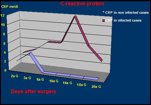 Laboratory testing for infection include nonspecific inflammatory markers that could be elevated in noninfectious diseases as well as in the early postoperative period. They include leukocytosis with significant increase in the percentage of neutrophils, increase in erythrocyte sedimentation rate (ESR) and C-reactive protein (CRP). In most cases, however, leukocytosis is uncommon and often not significant;5 also the ESR has a limited specificity in the study of a knee prosthesis sore.4,6,18,19 The CRP showed greater specificity as it tends to rise in the presence of infection while doesn't modified in the presence of a mechanical loosening of the prosthesis.6 In uncomplicated cases the CRP reaches maximum values at the 2nd-3rd day post-operatively and tends to be normal after 3 weeks, while in the presence of an infection process were consistently higher (Figure 2).4,6,12,18 Hence it is considered the cheapest test to rule out infection.
