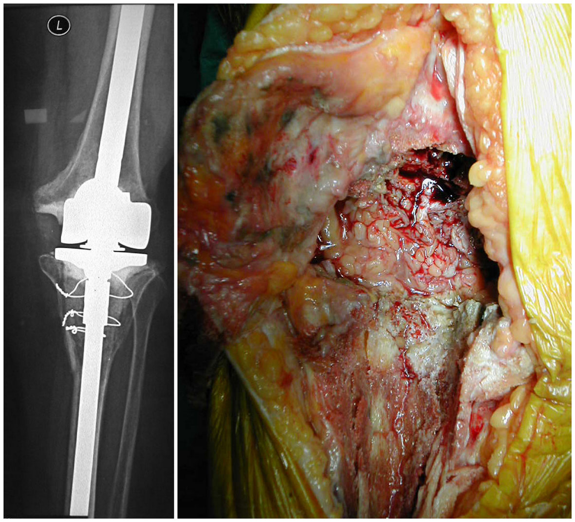 The clinical scenario largely varies. In many acute infections, there is a sudden onset of one or more of the following symptoms: pain, which does not heal with rest and worsens with load-bearing, stiffness, local heat, swelling, and sometimes fever. This condition is often preceded by superficial necrosis and/or persistent discharge from the surgical scar as blood serum, serous and finally purulent. The presence of a sinus tract, finally, documents the subfascial extension of the infectious process. In contrast, chronic infections usually don’t have many of acute signs and symptoms; they have an indolent course characterized by persistent joint pain with or without early implant failure (within 2-3 years after implantation), which makes it more difficult to distinguish from aseptic loosening.18