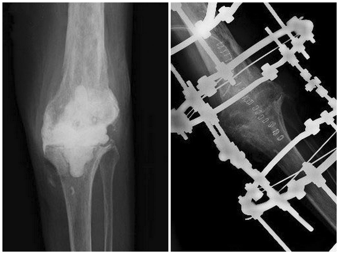 These data suggest that the bone union depends both on the fixator stability and by other factors, such as the type of prosthesis previously used which may influence the extent of bone loss and the bone quality, and consequently the bone contact and the possibility of compression. The best results have been observed after failure of resurfacing prosthesis compared with hinge implants, especially with intramedullary stems87 because the bone contact and compression of the articular heads are limited in the presence of cortical or sclerotic bone.