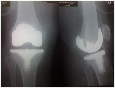 Follow up During the follow – up examination of the patient three years after the first total knee arthroplasty , two and a half year after the total hip arthroplasty and two years after the second total knee arthroplasty , the clinical and radiographic outcome was excellent. The patient walks normally and without the help of crutches, performs complete flexion and extension of the knees and complete movements of the right hip not accompanied by pain during the flexion, internal and external rotation. Comparison of the length of the two extremities showed no difference, the patient did not mention any pain in daily life activities (Figure 11).