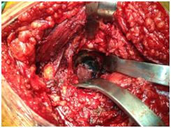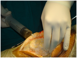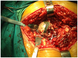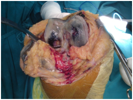 Figure 5 Image taken during the surgical approach, bone and meniscus pieces.
