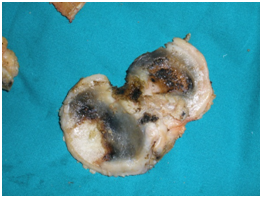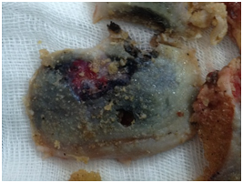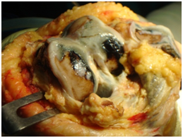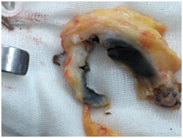 The patient was scheduled for surgery of total right knee arthroplasty. During the surgical approach of the knee we observed the dark pigmentation of the synovium, the bone cartilage, the quadriceps tendon and the menisci. This rare condition, characterized by many as ‘’Black Bone Disease’’, is accompanied by extensive destruction of the femoral condyles and the tibial Plateau due to arthritis. We performed a cemented total arthroplasty and sent pieces of the bones and the meniscus for histological examination (Figure 4).