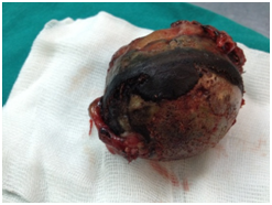 Histological examination confirmed the clinical diagnosis. The disease is ochronotic arthropathy or alcaptonuria. The confirmation was enhanced by urine examination as well as by examination of pieces of the synovium, the meniscus and bone pieces of the knee (Figure 5) and synovial liquid (Figure 6). At the overview of the patient we detected dark pigmentation of sclera, which is characteristic of alcaptonuria (Figure 7).