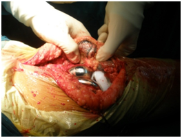 Figure 10 Total arthroplasty of left knee. The characteristic brownish color of the cartilaginous surfaces.
