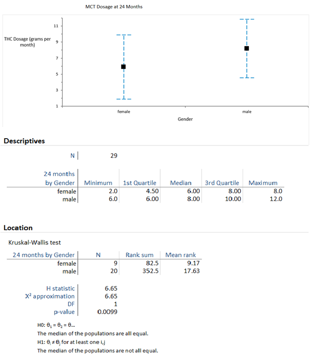 Dose increase was considered after a minimal period of three months. Dosage modification was based upon the patients’ individual consumption records analysis. The monthly MCT dosage was increased to 30 grams monthly at 15:3 THC:CBD ratio with 11-19% THC to 0-7% CBD. Another potential dose increase was at six months. In subjects satisfying the dose increase criteria, the dosage was increased to 30 grams of THC20:CBD4 ratio with 16-24%THC and 0-8%CBD. Dosage increase was considered every six months thereafter according to the same criteria. A maximal dose of 60 grams of 16-24%THC and 0-8%CBD was allowed.