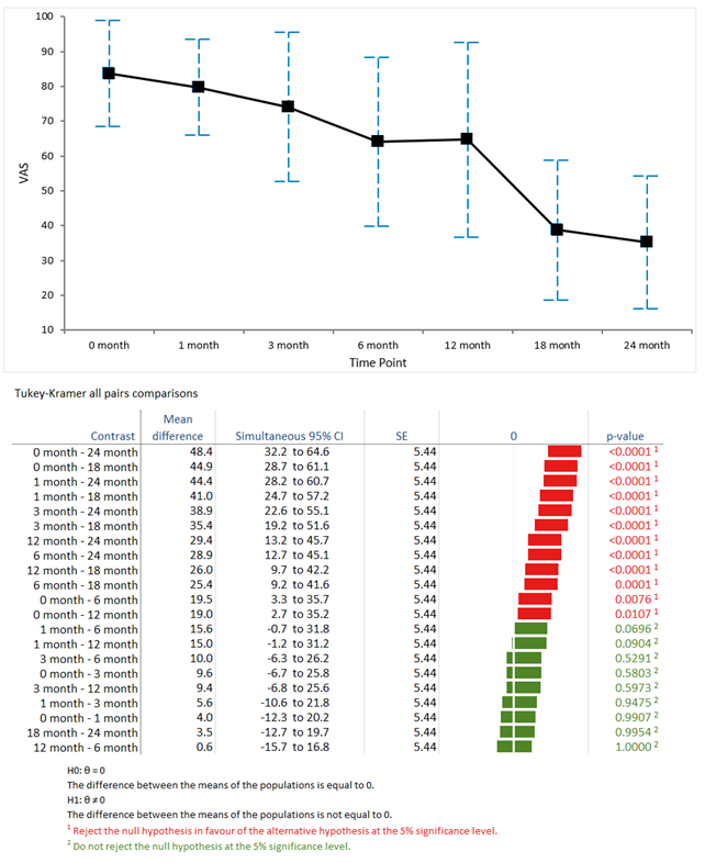 The therapeutic response (VAS as assessed using ANOVA) with regards to pain intensity was highly significant (Figure 3). VAS averaged 83±15.3 at baseline, and decreased to 35.3±19.3 (ANOVA, F-value 24.6, p<0.001). The BHC indicated that the difference from baseline in VAS was significant at the one month and later timepoints (p< 0.001) as compared with baseline VAS results. The improvement in VAS reached a plateau at 18-month, and the difference in VAS between 18-month and 24-month was not significant (BHP, p>0.06).