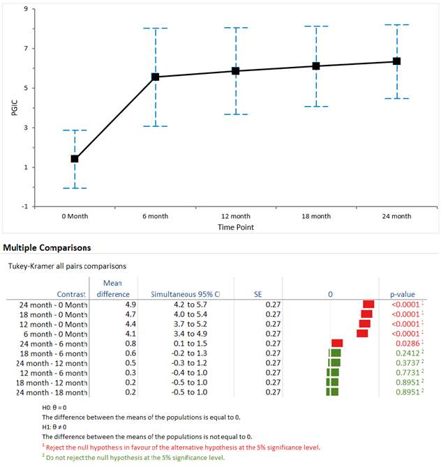 PGIC was significantly different between the 6-month timepoint and the 18-month timepoint (HCS, p<0.02) and compared with the 24-month timepoint (HCS, p<0.007) but was not significant comparing 6-month timepoint and the 12-month timepoint (HCS, p>0.2). Patients’ assessment of the treatment was performed at baseline (evaluation of prior treatments including pharmaceuticals, surgery and physiotherapy), and at each consecutive timepoint from the 6 months timepoint and onward. Earlier timepoints were not assessed as the therapy protocol was being established and the patient needs to adjust to the therapy (dosage and consumption wise).