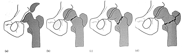 Figure 1 Proximal femoral fractures in children. These are the result of strong forces or weak bone, e.g. through cysts. There are 4 types (the Delbet classification), depending on the level of the fracture: (a) type-I at the physeal level; (b) type-II through the middle of the neck; (c) type-III at the base of the neck and (d) type-IV at the intertrochanteric level.