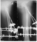 The blood vessels to the femoral head are easily damaged and a high incidence of osteonecrosis occurs in cervical and transepiphyseal fractures in children, even higher than in adults.6 Growth arrest in the physis can cause shortening of 15% of the total extremity. Varus or valgus angulation of the femoral neck also can occur from arrest of only one side of the physis. Hip fractures in children also differ from fractures in adults because a child can tolerate immobilization much more than an adult. Internal fixation with threaded pins in a child can be used to secure firm fixation of the femoral neck. In a child this can cause premature physeal closure and significant leg length in equality. According to Boitzy capsular distention and subsequent tamponade of the vessels may increase the incidence of osteonecrosis.4 Type-II transcervical fractures were at greater risk (50%) than type- III fracture. Gerber et al.5 concluded that immediate open reduction and internal fixation did not prevent osteonecrosis after displaced type-II and III fractures.5 Internal fixation is recommended for all type II fractures because most are unstable. Non-union also can occur if internal fixation is not used. A gentle closed reduction should be done with longitudinal traction, abduction and internal rotation followed by fixation with 1.5 mm multiple Ilizarov wires. We have done all these with the use of an image intensifier. The head and neck of a child’s femur are extremely hard and that’s why we avoided other devices for fear of distraction of the fracture and possible separation of the capital femoral epiphysis. Ilizarov’s wire holds the fragments nicely and because of numerous problems with noncompliance, a hip spica cast is used for 6-8 weeks, but in Ilizarov fixation it is not needed.