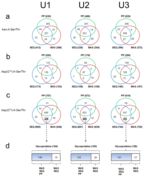 Figures a, b, c are Venn-Diagram comparisons of unmodified motifs Asn-X-Ser/Thr (a), deaminated motifs Asp(16O)-X-Ser/Thr (b), and deglycosylated motifs Asp(18O)-X-Ser/Thr (c).