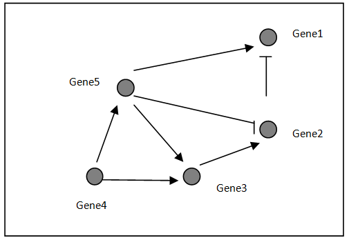 Thus, a GRN can be represented by a weight matrix đ=[đ€]Nxđ where the number of genes in the GRN is equal to đ.If there is no regulation between two genes, value of corresponding weight is zero and if there is a regulation, the weight should have finite value. Figure 1 shows an example of GRN.
