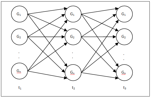 As the inputs of a classical Artificial Neural Networks are supplied only from the training data of present time instance, NNs are not suitable to model the dynamics of a system. However, RNN model is a closed loop NN with a delay variable between the outputs of each neuron in the output layer of the RNN to each of the neurons in the input layer that is appropriate to model temporal data. Moreover, the regulatory relationships among a group of genes can also be expressed with the help of the canonical Recurrent Neural Network formalism28 as shown in Figure 2. Each node symbolizes a particular gene and the edges between the nodes represent the regulatory interactions among the genes.