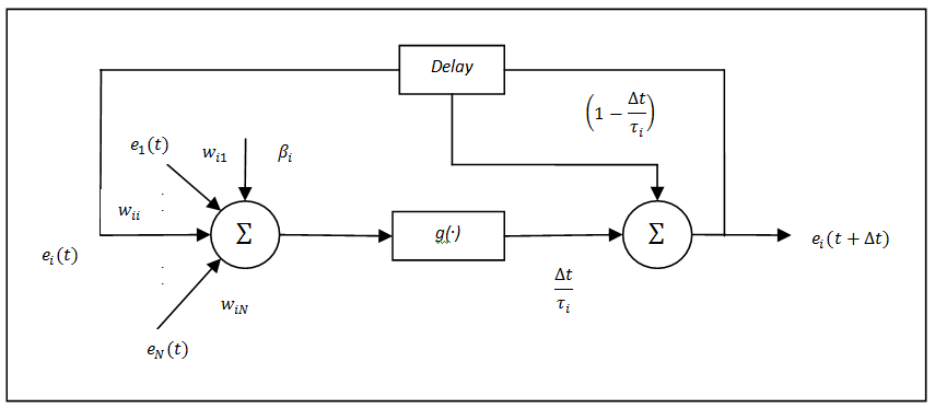 , and the corresponding weights (Wi,j) between others gene with that particular gene. For a canonical RNN model, it is assumed that each of the total N output neurons in the unit is a gene expression value of next time instance ei (t+ât), and the input neurons are the gene expression of present state ei(t) for same genes, thus they interact with each and every one in regenerative way. Â
