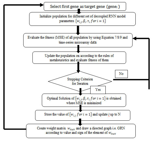 The RNN formalism is based on a set of parameters, wi,j,ÎČi,Ïi which we refer to as RNN model parameters in this paper. The reverse engineering of GRNs from temporal microarray data requires finding the optimum values of the RNN parameters with the help of suitable optimization techniques or metaheuristic. However, the principle underlying all optimization algorithms is the same. Every algorithm is initialized with a population of solutions i.e. different set of