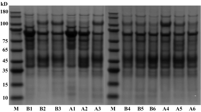 M: Protein marker; B1-6: Urinary protein samples before coffee intake; A1-6: Urinary protein samples after coffee intake.