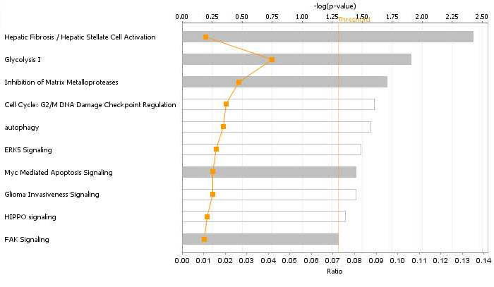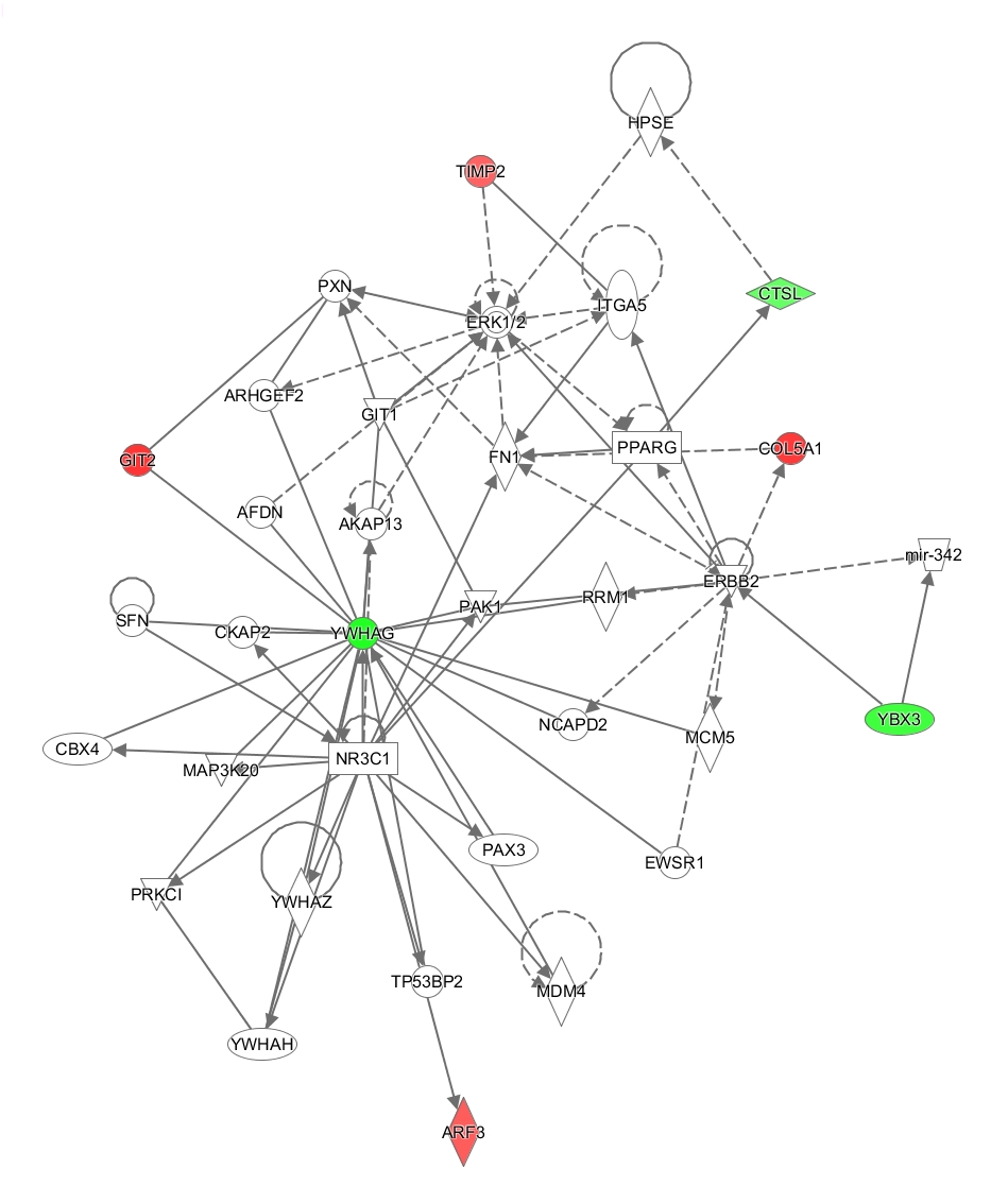 Eleven differentially expressed proteins were analyzed using the IPA tool to assess their association with important biological functions. The canonical pathway analysis demonstrated that protein changes were highly associated with Hepatic fibrosis/ hepatic stellate cell activation, Glycolysis and Inhibition of matrix metalloproteases signaling (Figure 5A). Metalloproteinase inhibitor 2 (TIMP2), involved in renal tubular epithelial cell cycle arrest in acute kidney injury, play a significant role in several pathways,13 such as Hepatic fibrosis/ hepatic stellate cell activation, Inhibition of matrix metalloproteases signaling and glioma invasiveness signaling. 14-3-3 protein gamma (YWHAG) also involved in several canonical pathways, such as cell cycle: G2/M DNA damage checkpoint regulation, ERK5 signaling, Myc mediated apoptosis signaling and HIPPO signaling.