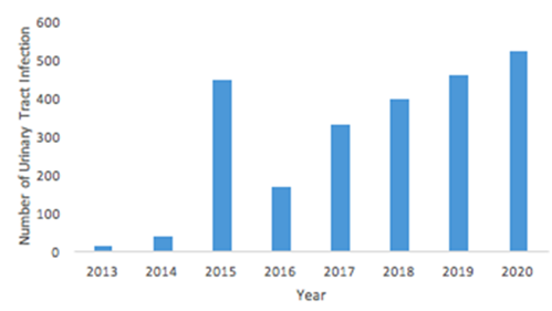 As shown in the charts below, the lowest incidence of reported urinary tract infections was in 2013 because it was a recently approved medication. As the years went on, more adverse events were being reported and thus the amount of urinary tract infections that was being reported increased tremendously. The reports reached a peak in 2015 when the FDA safety communication was released early that year. When all of the data was fed into the Google drive software it predicted that the amount of reported urinary tract infections over a 5year span. It showed a decrease in reports in 2016 followed by an increase over the next 4years. Overall by the year 2020, the prevalence of urinary tract infections will be at an all time high (Figure 1).