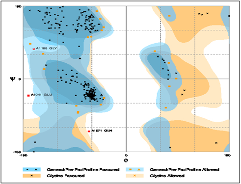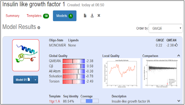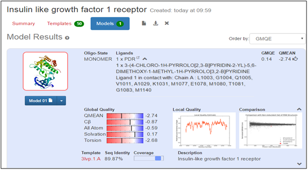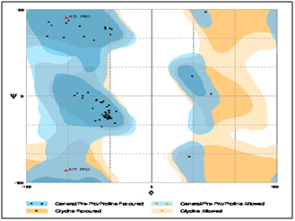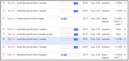 For homology modeling, template 1tgr.1.A and 3lvp.1.A along with sequence identity of 86.54% and 89.87% were selected respectively for IGF-I and IGF-IR by using SWISSMODEL/ Workspacec. The experimental structure used for the prediction of IGF-I and IGF-IR model as template were the monomers of X ray diffraction method along with 1.4Å and 3.0Å (Figure 3) (Figure 4). By using Swiss-PdbViewer, the 3D structure of IGF-I and IGF-IR were predicted on the basis of homology modeling.35 The structural alignments were generated from Swiss model server by aligning sequences of IGF-I and IGF-IR with respective template proteins (Figure 5 & 6). Model quality was estimated by assessing the QMEAN score, which stands for qualitative model energy analysis is composite scoring function describing the major geometrical aspects of protein structures. QMEAN was tested on several standard decoy sets including a molecular dynamics simulation decoy set as well as on a comprehensive data set. QMEAN shows a statistically significant improvement over nearly all quality measures describing the ability of the scoring function to identify the native structure and discriminate good from bad models.36 The conformations of the predicted 3D structures (Figure 7 & 8) of the proteins were validated by Ramachandran plot (phi/psi). The stereochemical analysis37 of IGF-I by RAMPAGE showed number of residues in favoured region is 96.7% and in outlier region is 3.3% (Figure 9), whereas in case of IGF-IR, the RAMPAGE analysis of suggested 92.2% of residues remains in the favoured region, 6.8% in allowed region and 1.0% in outlier region (Figure 10), which indicates that both of the models are likely to be correct in prediction.38